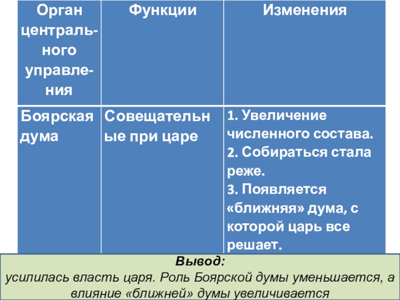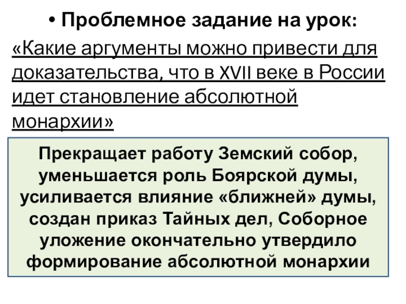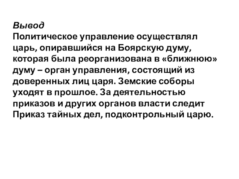 Прекращает работу Земский собор, уменьшается роль Боярской думы, усиливается влияние «ближней» думы, создан приказ Тайных дел, Соборное уложение окончательно утвердило формирование абсолютной монархии