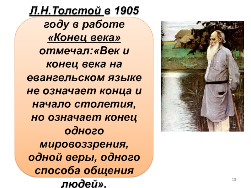 Слайд 13Л.Н.Толстой в 1905 году в работе «Конец века» отмечал:«Век и