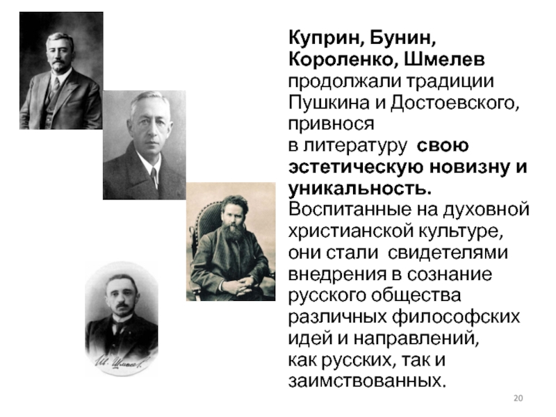 Слайд 20Куприн, Бунин, Короленко, Шмелев продолжали традиции Пушкина и Достоевского, привнося