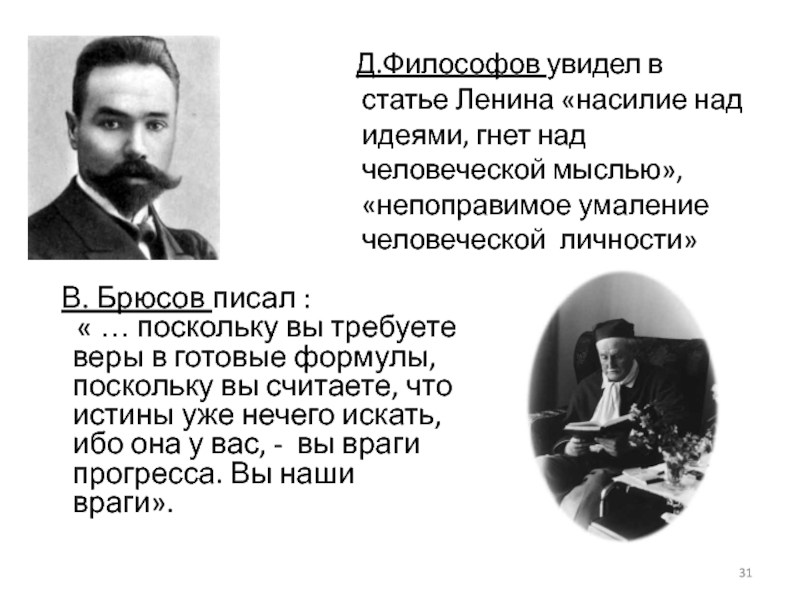 Д.Философов увидел в статье Ленина «насилие над идеями, гнет над человеческой мыслью», «непоправимое умаление человеческой личности»