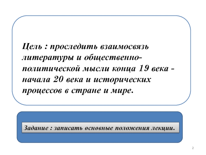 Слайд 2Цель : проследить взаимосвязь литературы и общественно-политической мысли конца 19