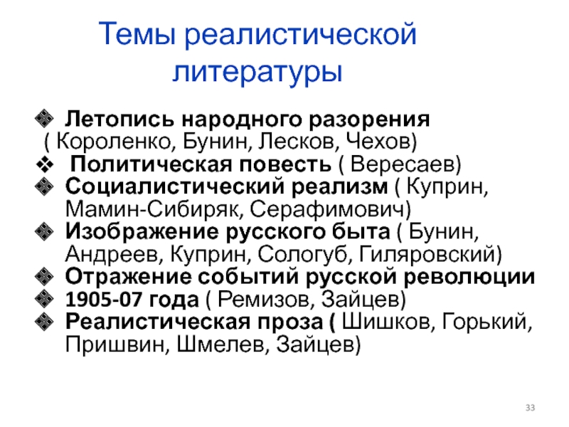 Слайд 33Темы реалистической литературы
