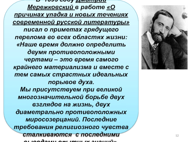 В 1893 году Дмитрий Мережковский в работе «О причинах упадка