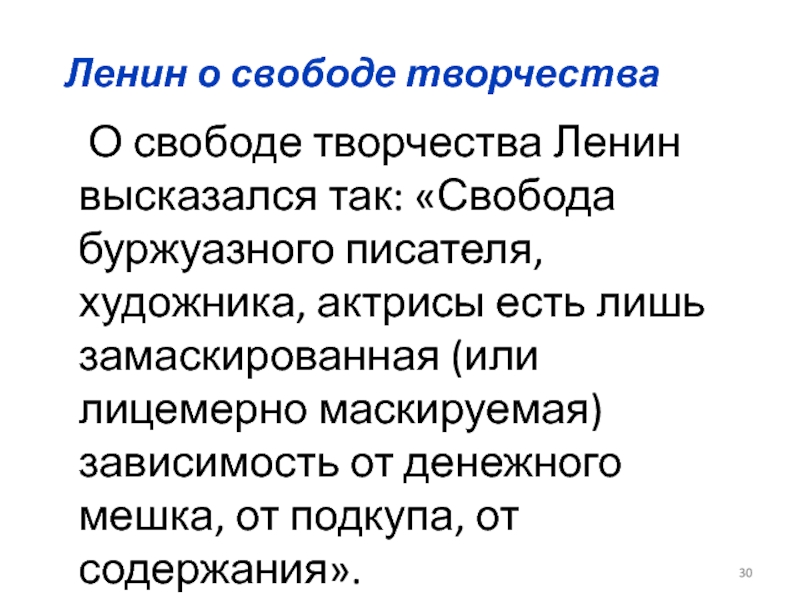 Слайд 30Ленин о свободе творчества