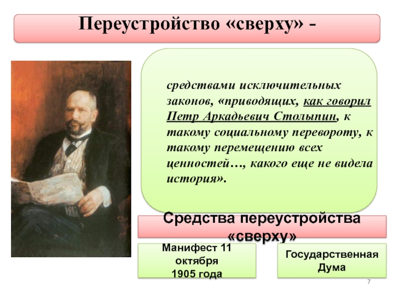 Слайд 7средствами исключительных законов, «приводящих, как говорил Петр Аркадьевич Столыпин, к
