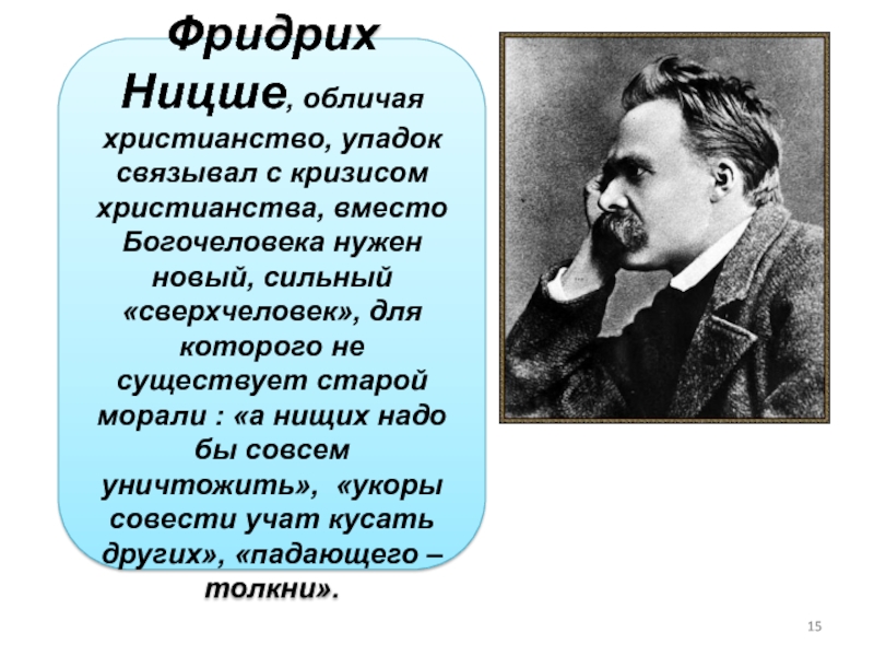 Слайд 15Фридрих Ницше, обличая христианство, упадок связывал с кризисом христианства, вместо