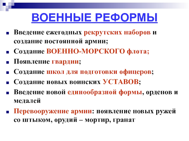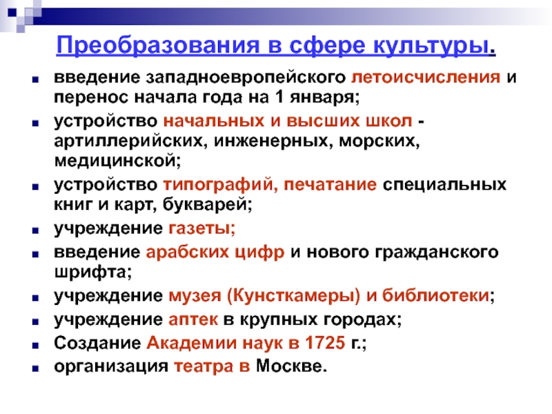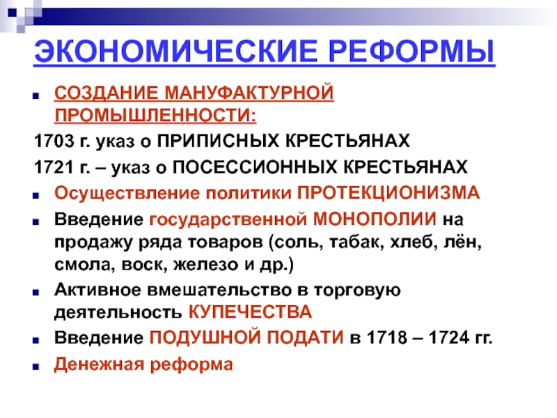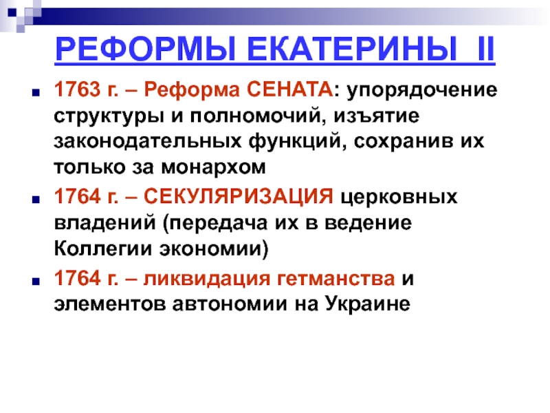 – СЕКУЛЯРИЗАЦИЯ церковных владений (передача их в ведение Коллегии экономии)
