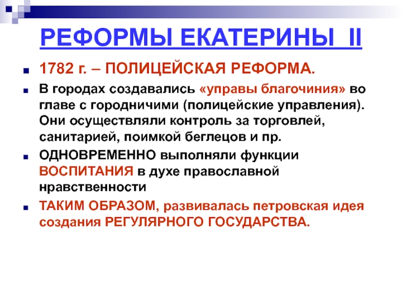 ТАКИМ ОБРАЗОМ, развивалась петровская идея создания РЕГУЛЯРНОГО ГОСУДАРСТВА.