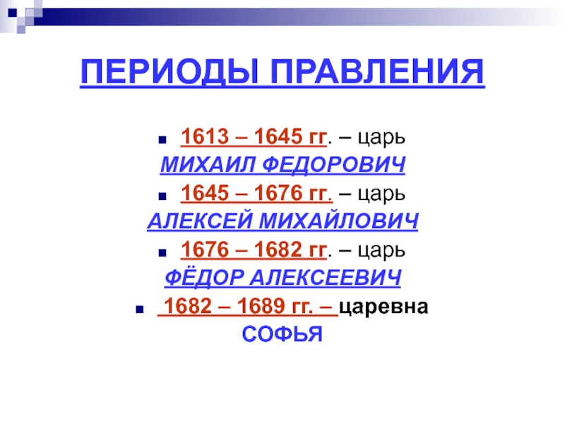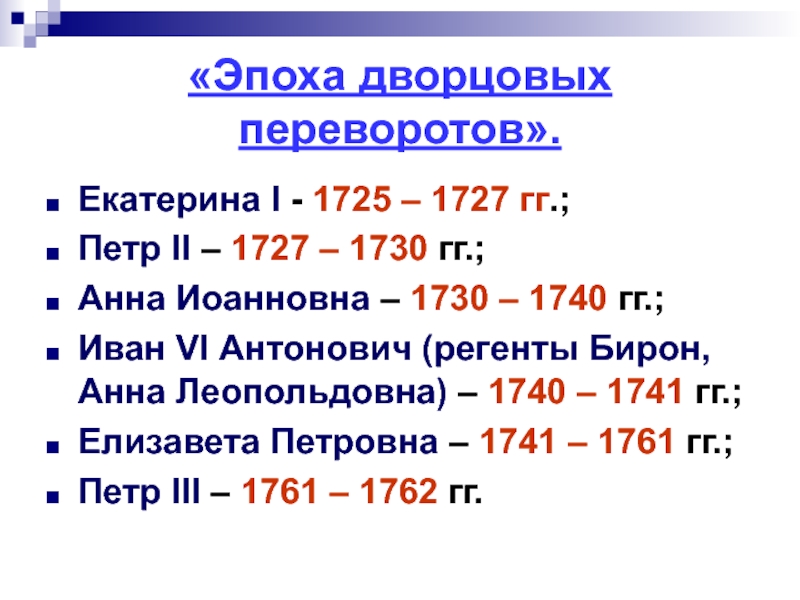 Иван VI Антонович (регенты Бирон, Анна Леопольдовна) – 1740 – 1741 гг.;