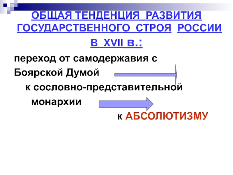 Слайд 14ОБЩАЯ ТЕНДЕНЦИЯ РАЗВИТИЯ ГОСУДАРСТВЕННОГО СТРОЯ РОССИИ В ХVII в.: