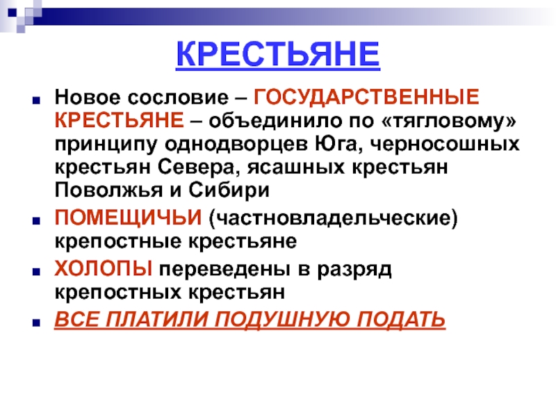 частновладельческие (помещичьи, крепостные), удельные или дворцовые (принадлежащие царской семье), черносошные (свободные общинники)