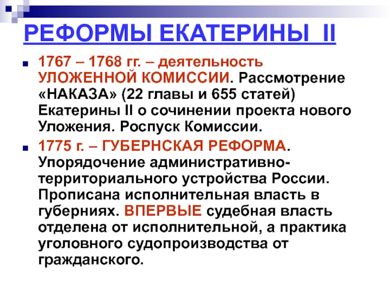 1775 г. – ГУБЕРНСКАЯ РЕФОРМА. Упорядочение административно-территориального устройства России. Прописана исполнительная власть в губерниях. ВПЕРВЫЕ судебная власть отделена от исполнительной, а практика уголовного судопроизводства от гражданского.