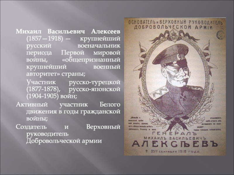 Слайд 31Михаил Васильевич Алексеев (1857—1918) — крупнейший русский военачальник периода Первой мировой