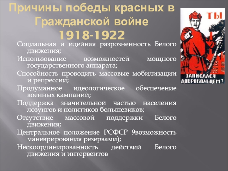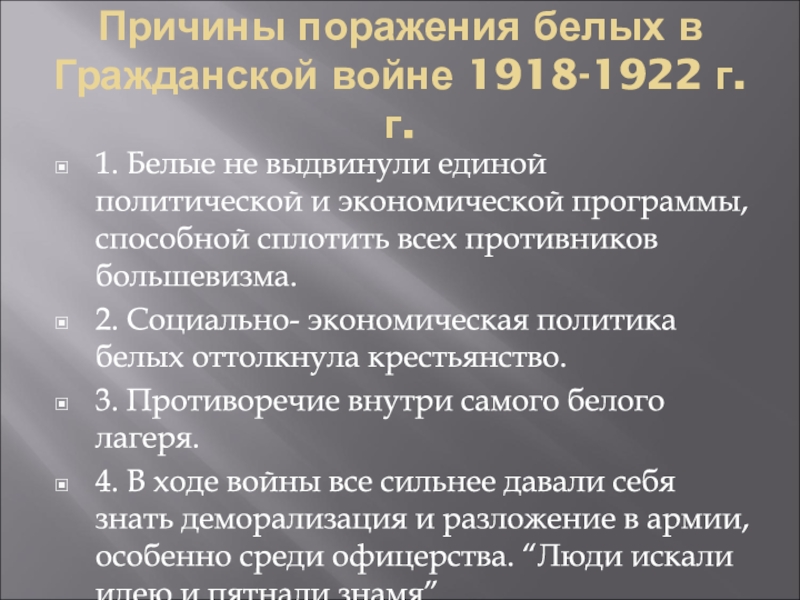 Слайд 43Причины поражения белых в Гражданской войне 1918-1922 г.г.