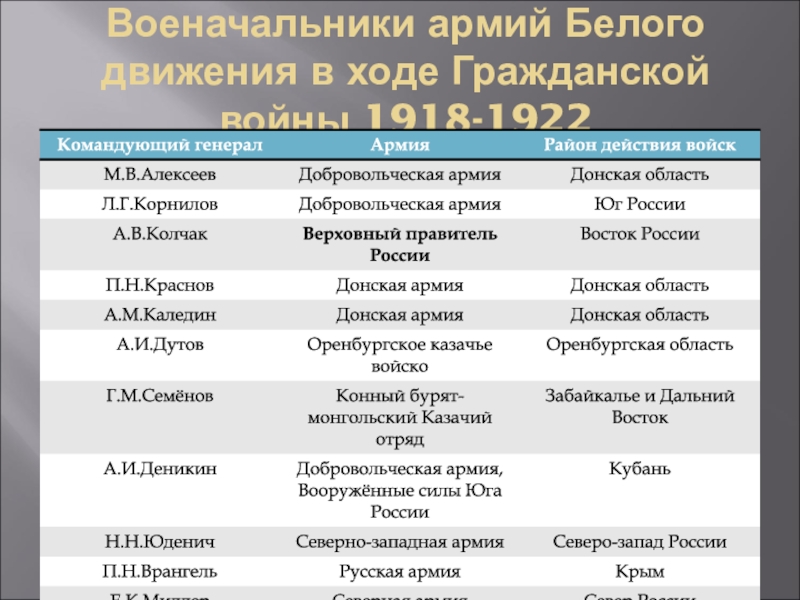 Слайд 30Военачальники армий Белого движения в ходе Гражданской войны 1918-1922