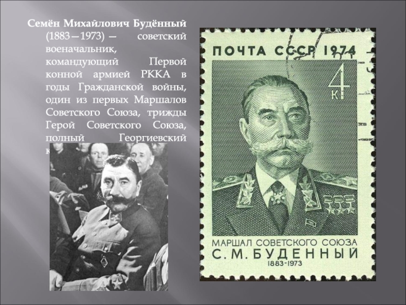 Слайд 22Семён Михайлович Будённый (1883—1973) — советский военачальник, командующий Первой конной армией
