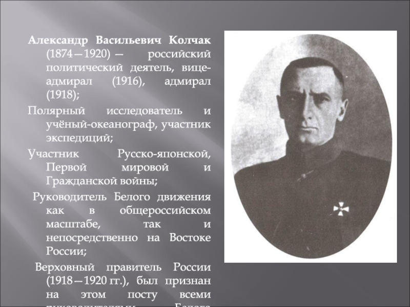 Слайд 33Александр Васильевич Колчак (1874—1920) — российский политический деятель, вице-адмирал (1916), адмирал