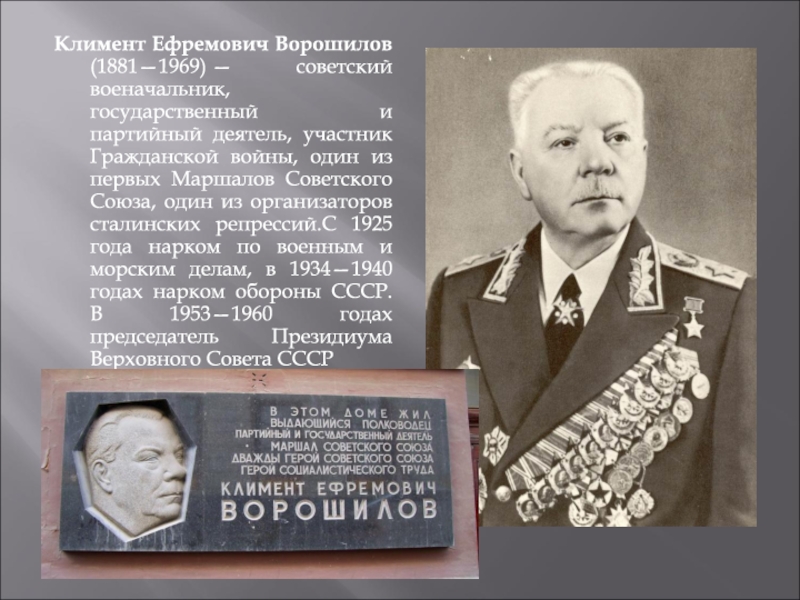 Слайд 24Климент Ефремович Ворошилов (1881—1969) — советский военачальник, государственный и партийный деятель,