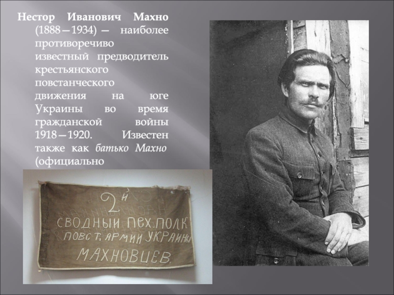 Слайд 46Нестор Иванович Махно (1888—1934) — наиболее противоречиво известный предводитель крестьянского повстанческого