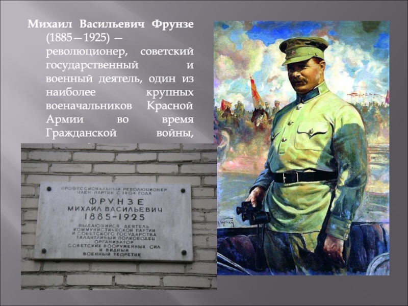 Слайд 17Михаил Васильевич Фрунзе (1885—1925) — революционер, советский государственный и военный деятель,