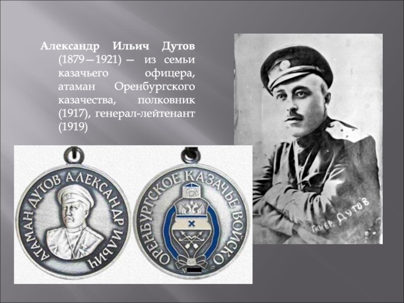 Слайд 37Александр Ильич Дутов (1879—1921) — из семьи казачьего офицера, атаман Оренбургского