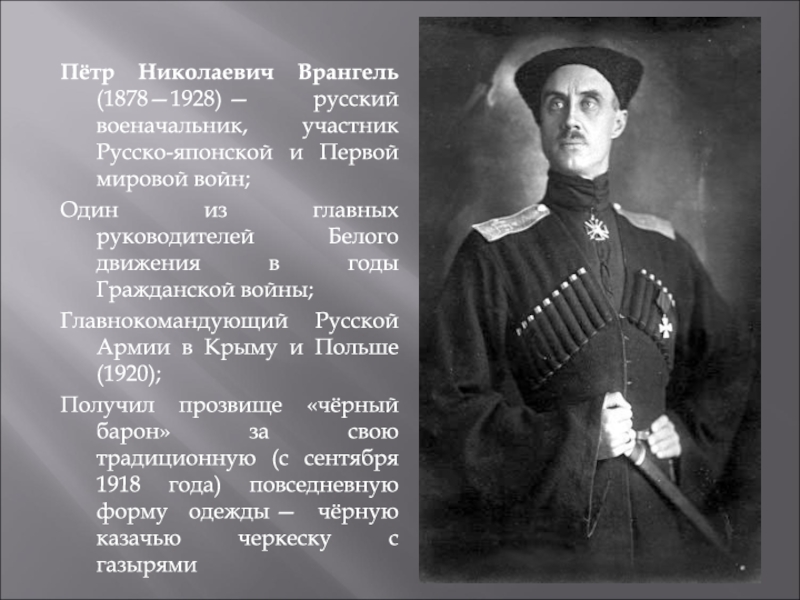 Слайд 41Пётр Николаевич Врангель (1878—1928) — русский военачальник, участник Русско-японской и Первой