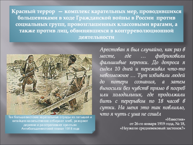 Слайд 15Красный террор — комплекс карательных мер, проводившихся большевиками в ходе