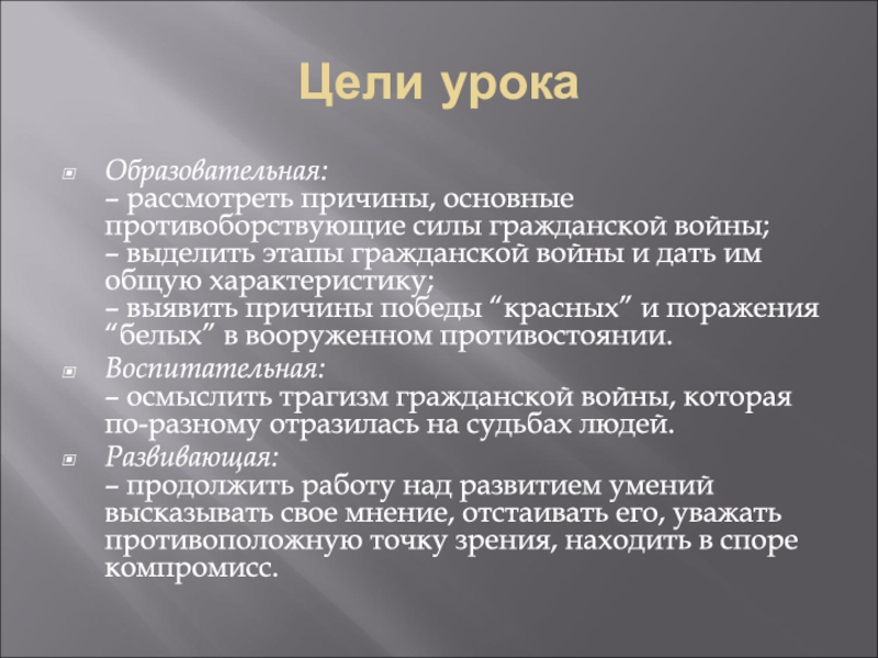 – рассмотреть причины, основные противоборствующие силы гражданской войны;