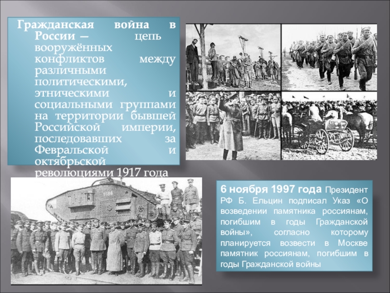 Слайд 4Гражданская война в России — цепь вооружённых конфликтов между различными политическими,