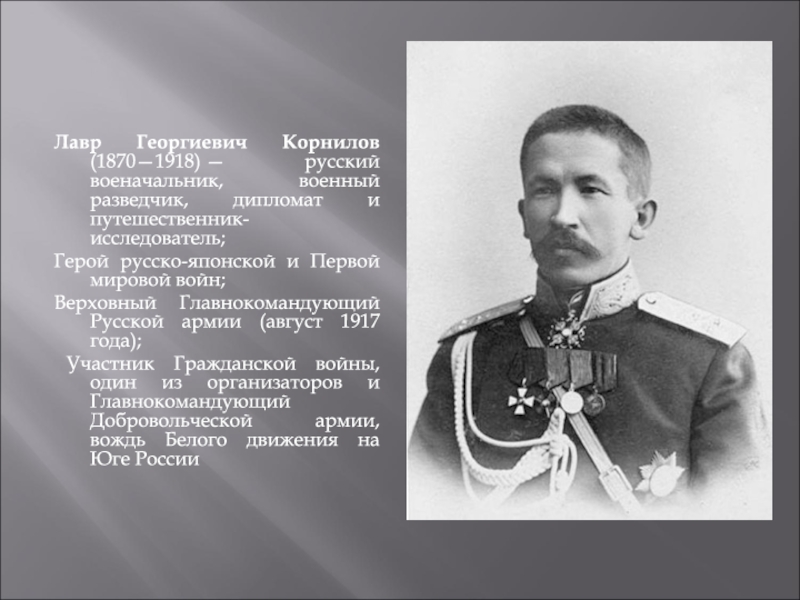 Слайд 32Лавр Георгиевич Корнилов (1870—1918) — русский военачальник, военный разведчик, дипломат и