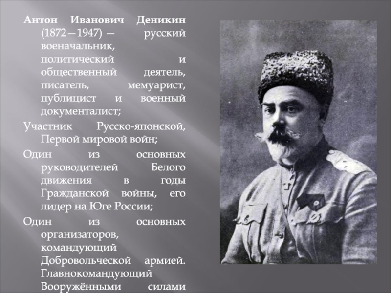 Слайд 39Антон Иванович Деникин (1872—1947) — русский военачальник, политический и общественный деятель,