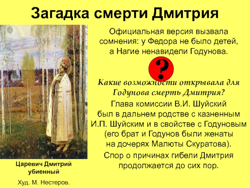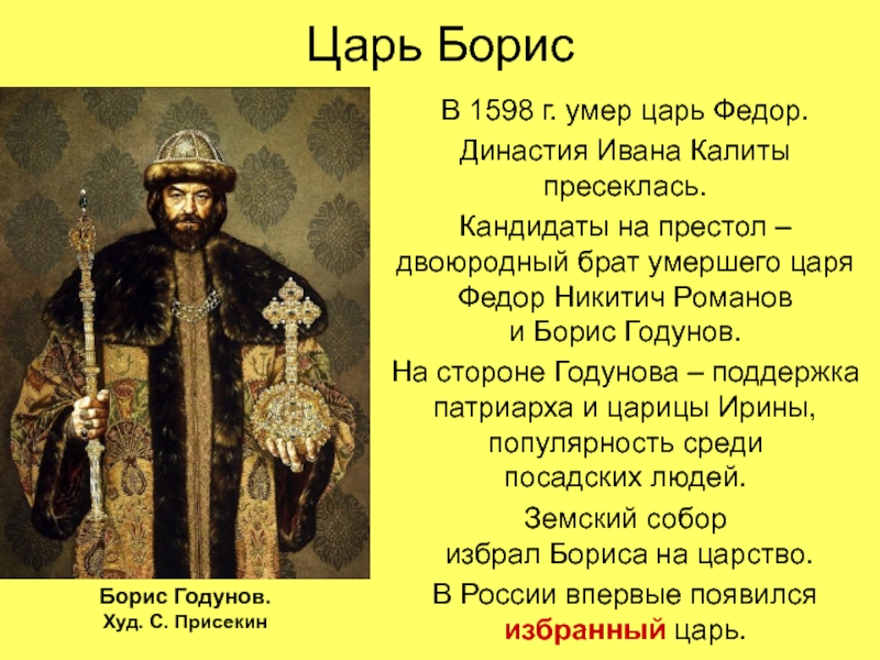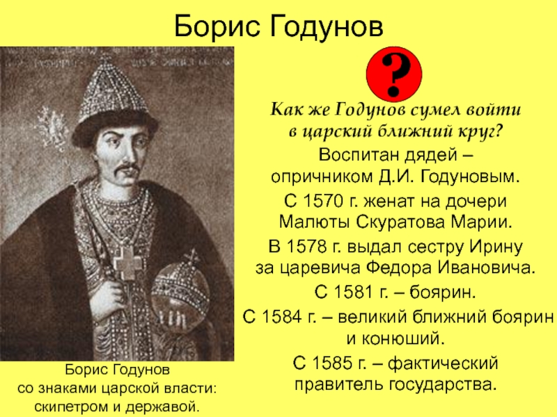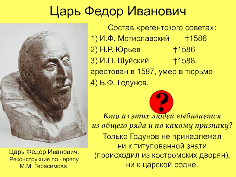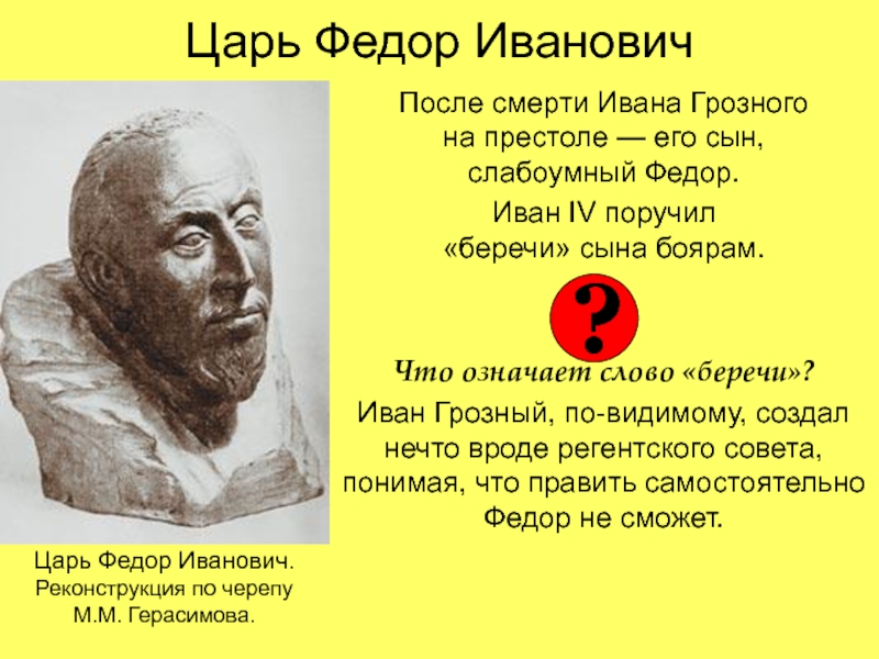 Грозный, по-видимому, создал нечто вроде регентского совета, понимая, что править самостоятельно Федор не сможет. Царь Федор Иванович.