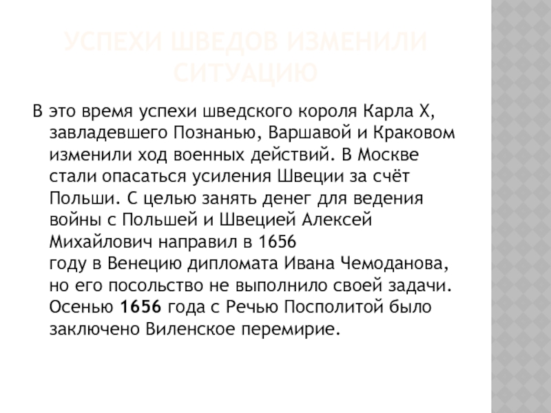 завладевшего Познанью, Варшавой и Краковом изменили ход военных действий. В Москве стали опасаться усиления Швеции за