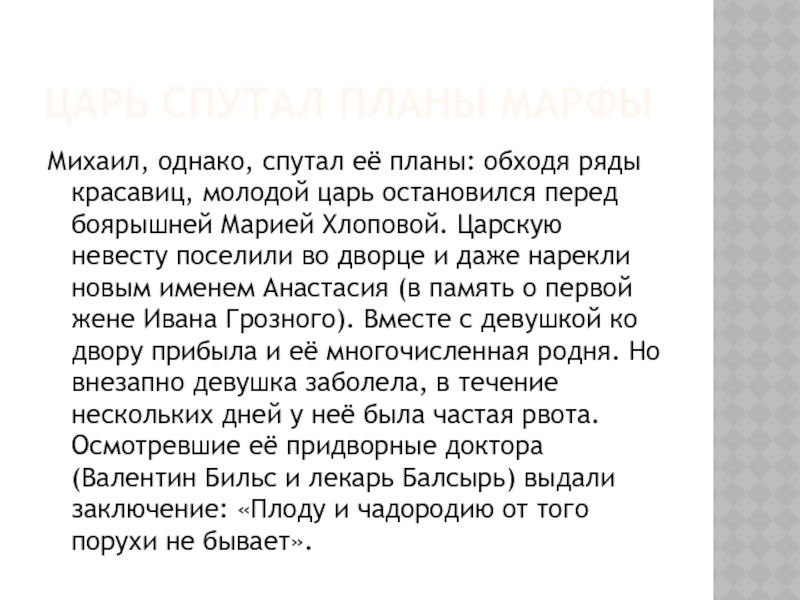 во дворце и даже нарекли новым именем Анастасия (в память о первой жене Ивана Грозного). Вместе с девушкой ко двору прибыла и её многочисленная родня. Но внезапно девушка заболела, в течение нескольких дней у неё была частая рвота. Осмотревшие её придворные доктора (Валентин Бильс и лекарь Балсырь) выдали заключение: «Плоду и чадородию от того порухи не бывает».
