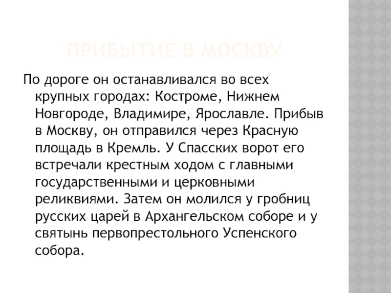 Кремль. У Спасских ворот его встречали крестным ходом с главными государственными и церковными реликвиями. Затем он молился у гробниц русских царей в Архангельском соборе и у святынь первопрестольного Успенского собора.