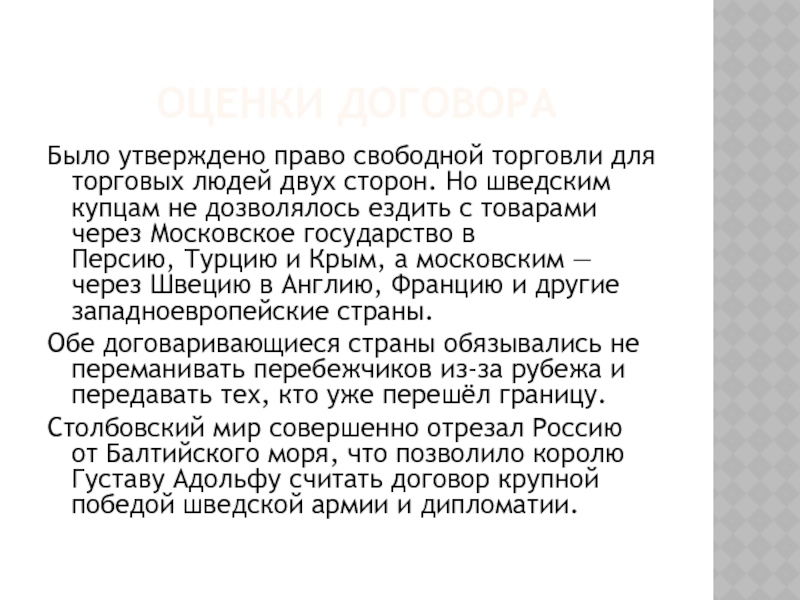 Столбовский мир совершенно отрезал Россию от Балтийского моря, что позволило королю Густаву Адольфу считать договор крупной победой шведской армии и дипломатии.