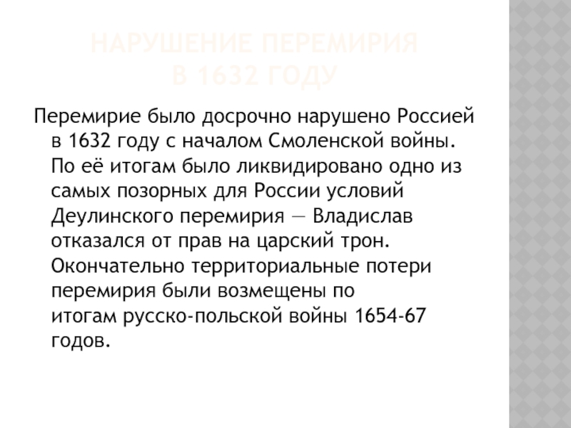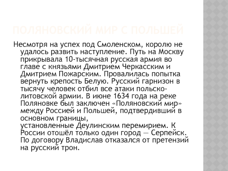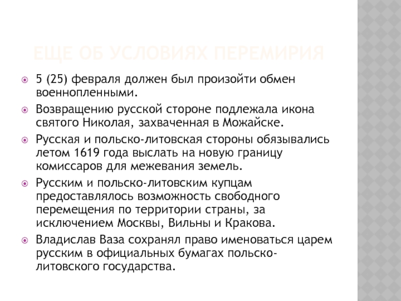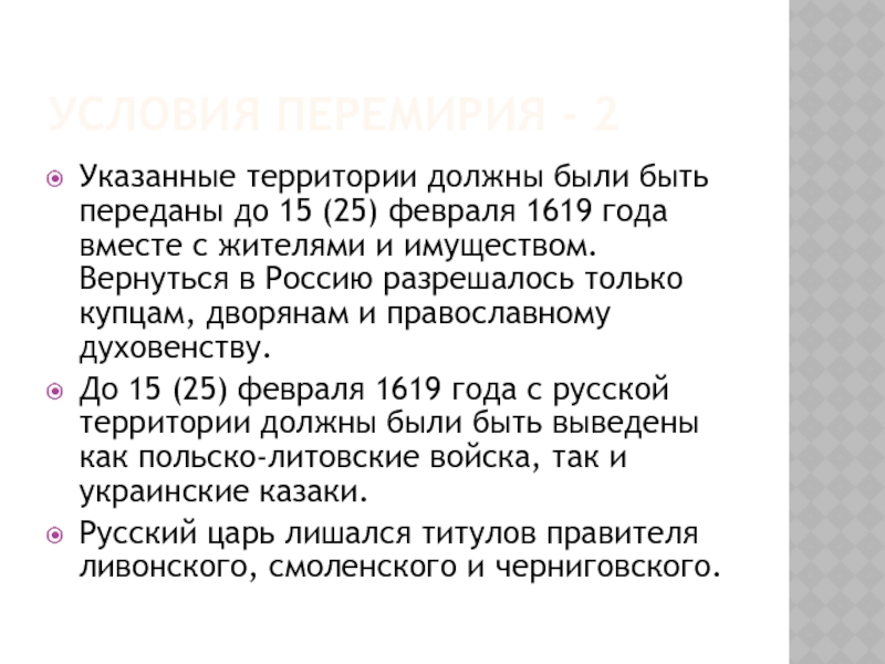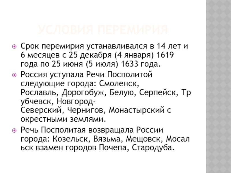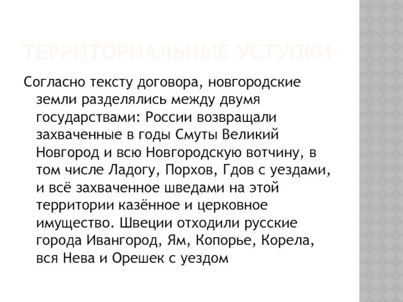 том числе Ладогу, Порхов, Гдов с уездами, и всё захваченное шведами на этой территории казённое и церковное имущество. Швеции отходили русские города Ивангород, Ям, Копорье, Корела, вся Нева и Орешек с уездом