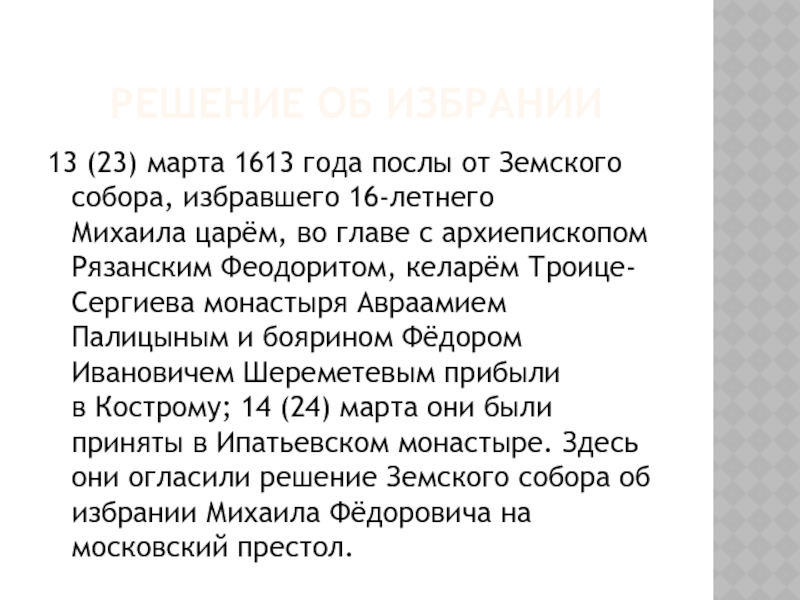 Ивановичем Шереметевым прибыли в Кострому; 14 (24) марта они были приняты в Ипатьевском монастыре. Здесь они огласили решение Земского собора об избрании Михаила Фёдоровича на московский престол.