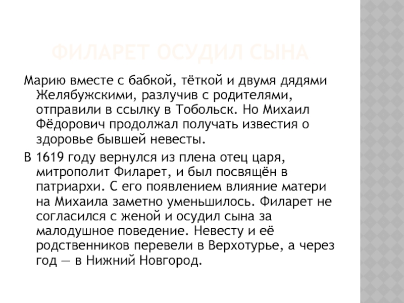 В 1619 году вернулся из плена отец царя, митрополит Филарет, и был посвящён в патриархи. С его появлением влияние матери на Михаила заметно уменьшилось. Филарет не согласился с женой и осудил сына за малодушное поведение. Невесту и её родственников перевели в Верхотурье, а через год — в Нижний Новгород.
