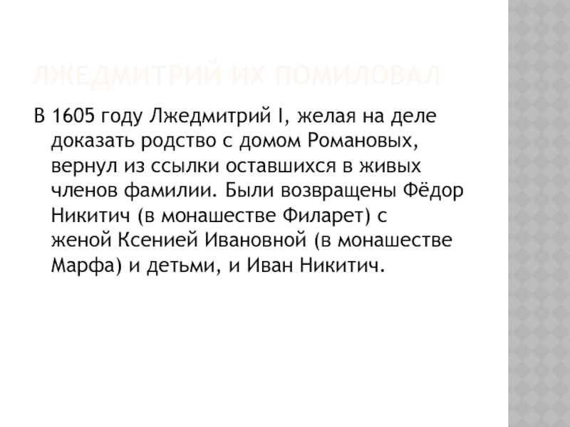 фамилии. Были возвращены Фёдор Никитич (в монашестве Филарет) с женой Ксенией Ивановной (в монашестве Марфа) и детьми, и Иван Никитич.