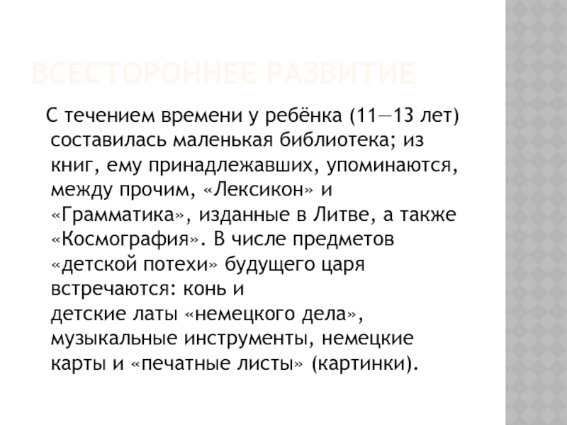 и «Грамматика», изданные в Литве, а также «Космография». В числе предметов «детской потехи» будущего царя встречаются: конь и детские латы «немецкого дела», музыкальные инструменты, немецкие карты и «печатные листы» (картинки).