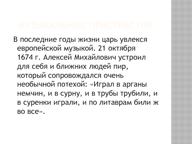В последние годы жизни царь увлекся европейской музыкой. 21