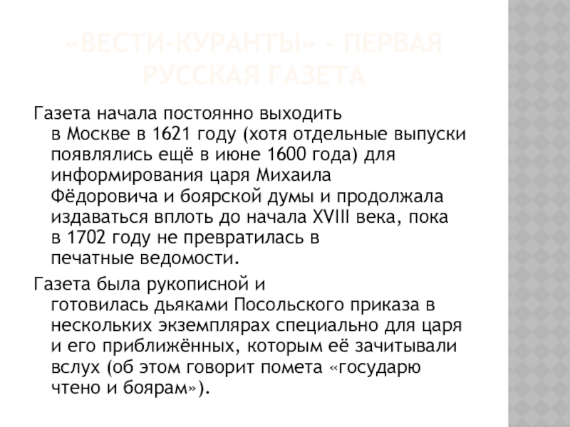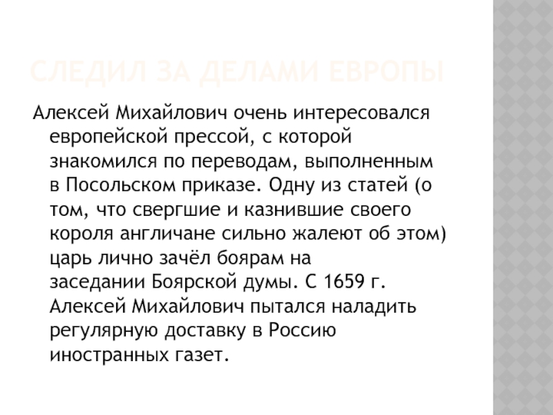 (о том, что свергшие и казнившие своего короля англичане сильно жалеют об этом) царь лично зачёл боярам на заседании Боярской думы. С 1659 г. Алексей Михайлович пытался наладить регулярную доставку в Россию иностранных газет.