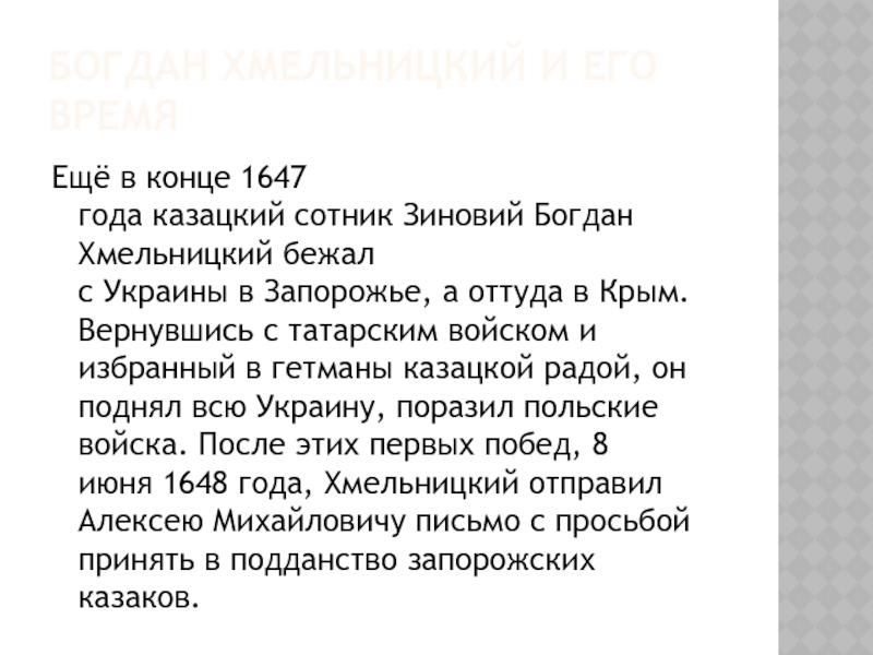 в гетманы казацкой радой, он поднял всю Украину, поразил польские войска. После этих первых побед, 8 июня 1648 года, Хмельницкий отправил Алексею Михайловичу письмо с просьбой принять в подданство запорожских казаков.