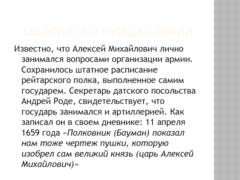 датского посольства Андрей Роде, свидетельствует, что государь занимался и артиллерией. Как записал он в своем дневнике: 11 апреля 1659 года «Полковник (Бауман) показал нам тоже чертеж пушки, которую изобрел сам великий князь (царь Алексей Михайлович)»