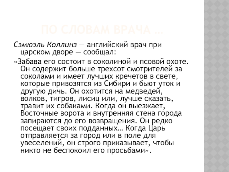 больше трехсот смотрителей за соколами и имеет лучших кречетов в свете, которые привозятся из Сибири и бьют уток и другую дичь. Он охотится на медведей, волков, тигров, лисиц или, лучше сказать, травит их собаками. Когда он выезжает, Восточные ворота и внутренняя стена города запираются до его возвращения. Он редко посещает своих подданных… Когда Царь отправляется за город или в поле для увеселений, он строго приказывает, чтобы никто не беспокоил его просьбами».