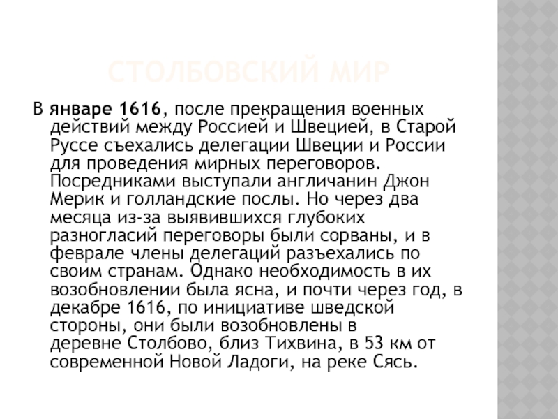 переговоров. Посредниками выступали англичанин Джон Мерик и голландские послы. Но через два месяца из-за выявившихся глубоких разногласий переговоры были сорваны, и в феврале члены делегаций разъехались по своим странам. Однако необходимость в их возобновлении была ясна, и почти через год, в декабре 1616, по инициативе шведской стороны, они были возобновлены в деревне Столбово, близ Тихвина, в 53 км от современной Новой Ладоги, на реке Сясь.