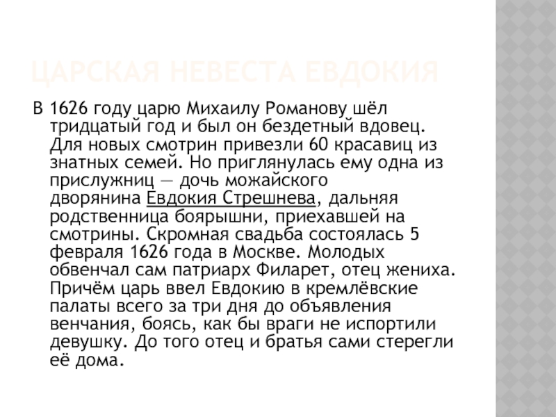 из знатных семей. Но приглянулась ему одна из прислужниц — дочь можайского дворянина Евдокия Стрешнева, дальняя родственница боярышни, приехавшей на смотрины. Скромная свадьба состоялась 5 февраля 1626 года в Москве. Молодых обвенчал сам патриарх Филарет, отец жениха. Причём царь ввел Евдокию в кремлёвские палаты всего за три дня до объявления венчания, боясь, как бы враги не испортили девушку. До того отец и братья сами стерегли её дома.