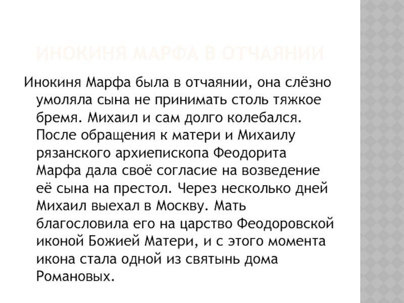 После обращения к матери и Михаилу рязанского архиепископа Феодорита Марфа дала своё согласие на возведение её сына на престол. Через несколько дней Михаил выехал в Москву. Мать благословила его на царство Феодоровской иконой Божией Матери, и с этого момента икона стала одной из святынь дома Романовых.