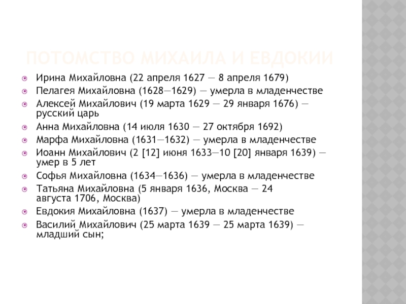 Михайловна (1628—1629) — умерла в младенчестве